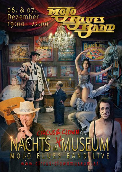 2. Mojo Blues Band nachts im Museum – Wir sind stets bestrebt unsere Auftritte nicht zur Routine werden zu lassen und nicht zuletzt liegt es auch am Ambiente der jeweiligen Spielstätte. So besuchte ich unlängst das Wiener Zirkus- und Clownmuseum und auf Grund gegenseitiger Sympathie mit den dortigen Betreibern entstand spontan die Idee für eine besondere Show.