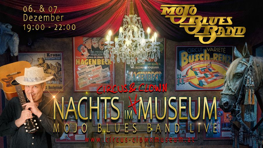 2. Mojo Blues Band nachts im Museum – Wir sind stets bestrebt unsere Auftritte nicht zur Routine werden zu lassen und nicht zuletzt liegt es auch am Ambiente der jeweiligen Spielstätte. So besuchte ich unlängst das Wiener Zirkus- und Clownmuseum und auf Grund gegenseitiger Sympathie mit den dortigen Betreibern entstand spontan die Idee für eine besondere Show.